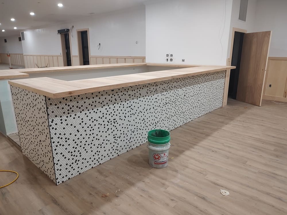 The highlight was a mosaic bar counter installation, paired with additional tile installation to create a durable, easy-to-clean finish with a high-end look that fits the atmosphere of the space.